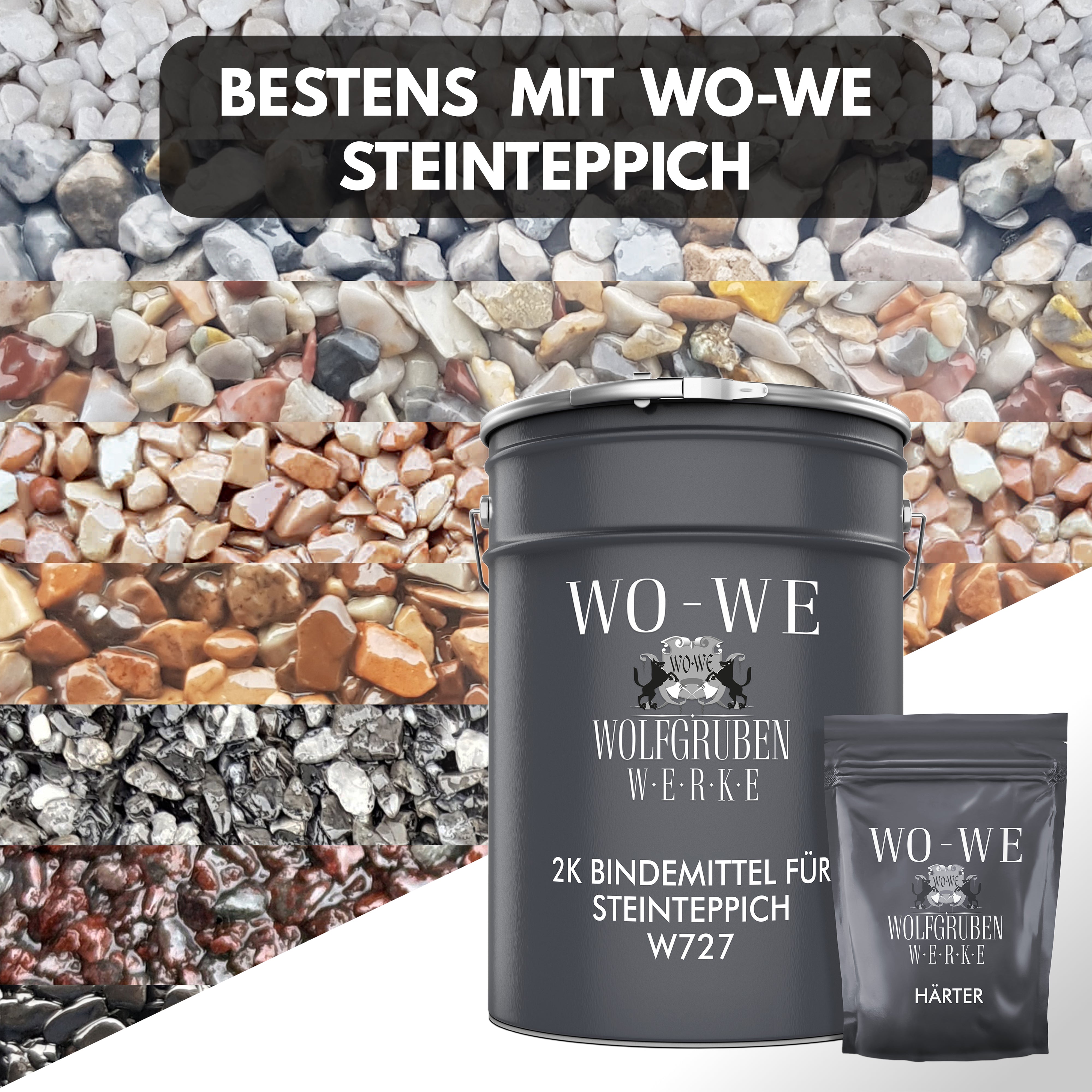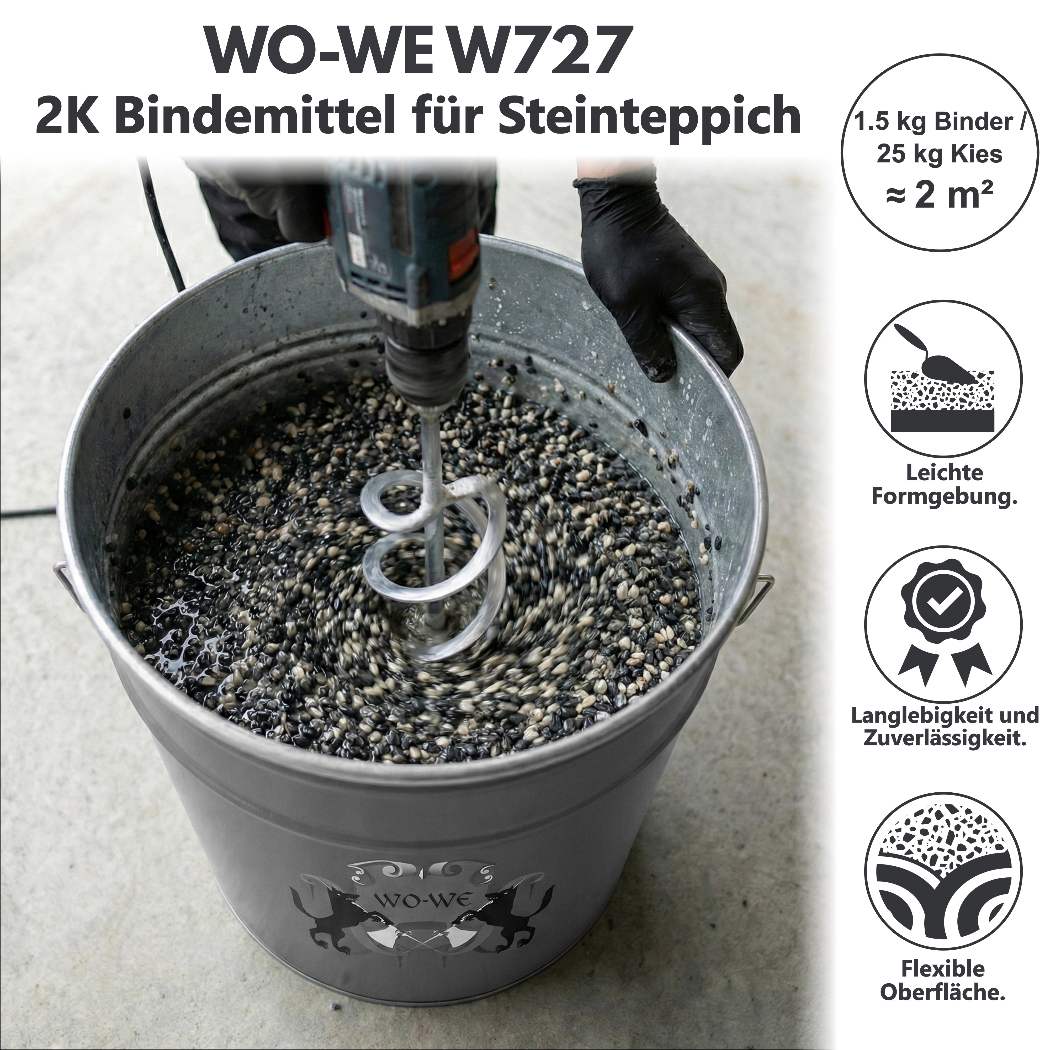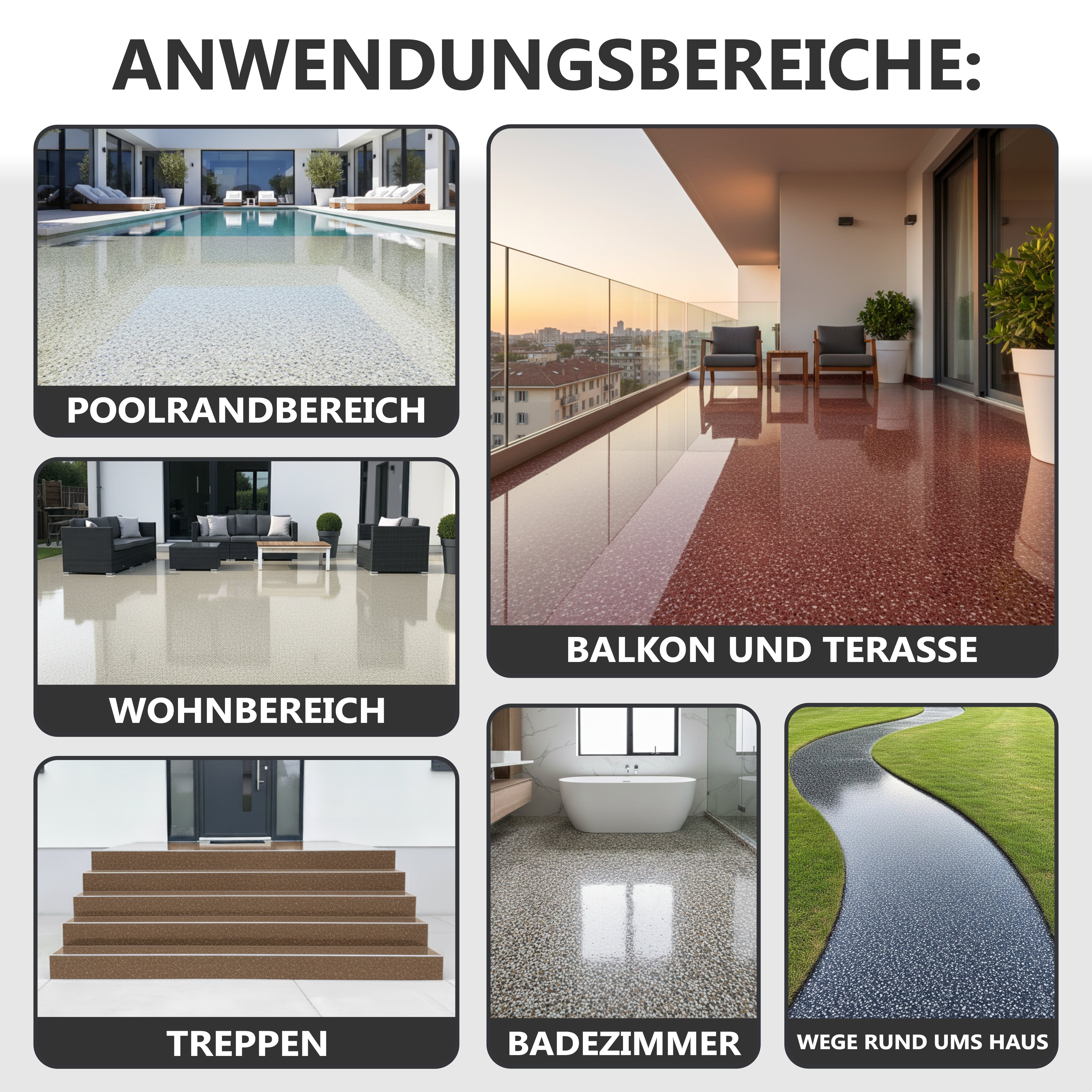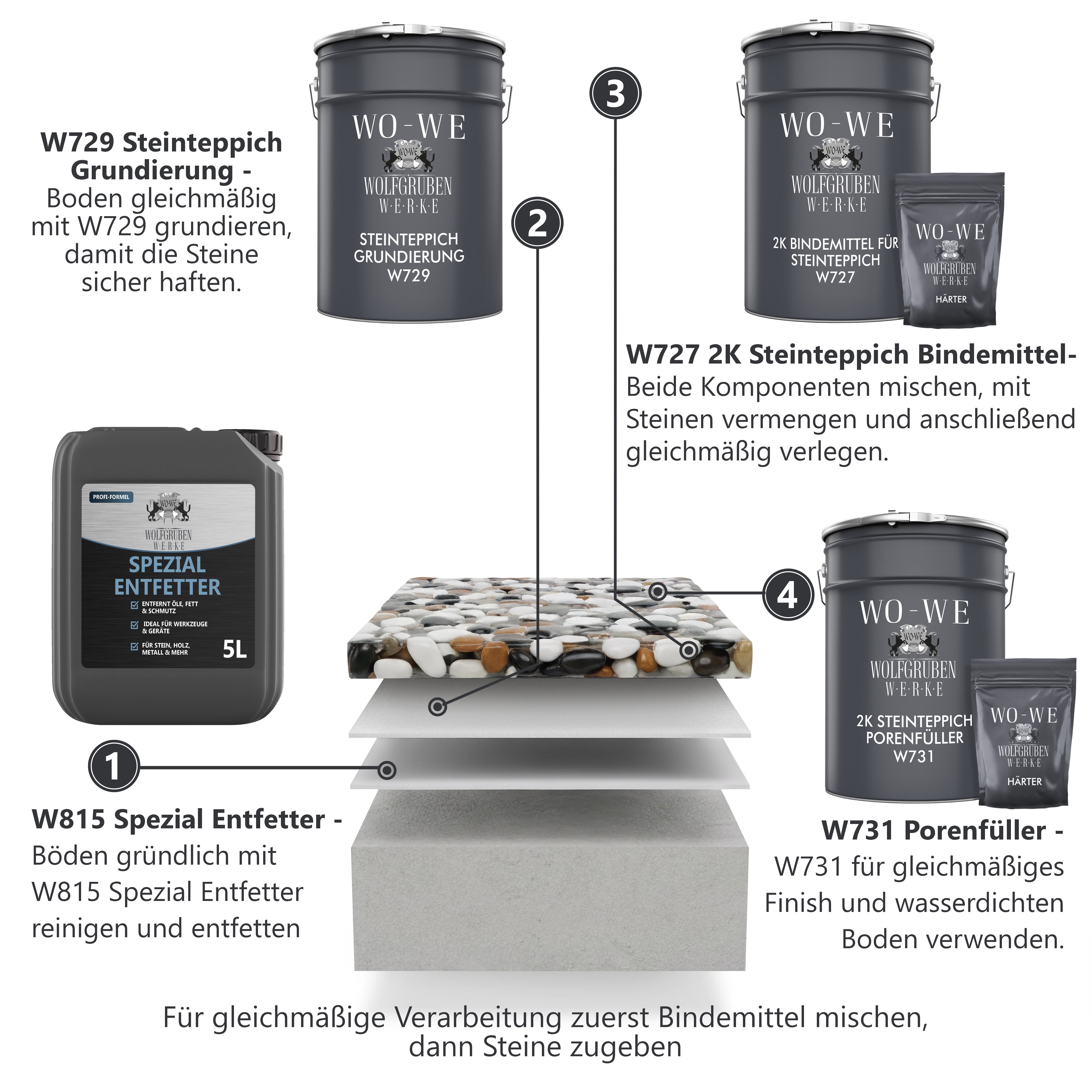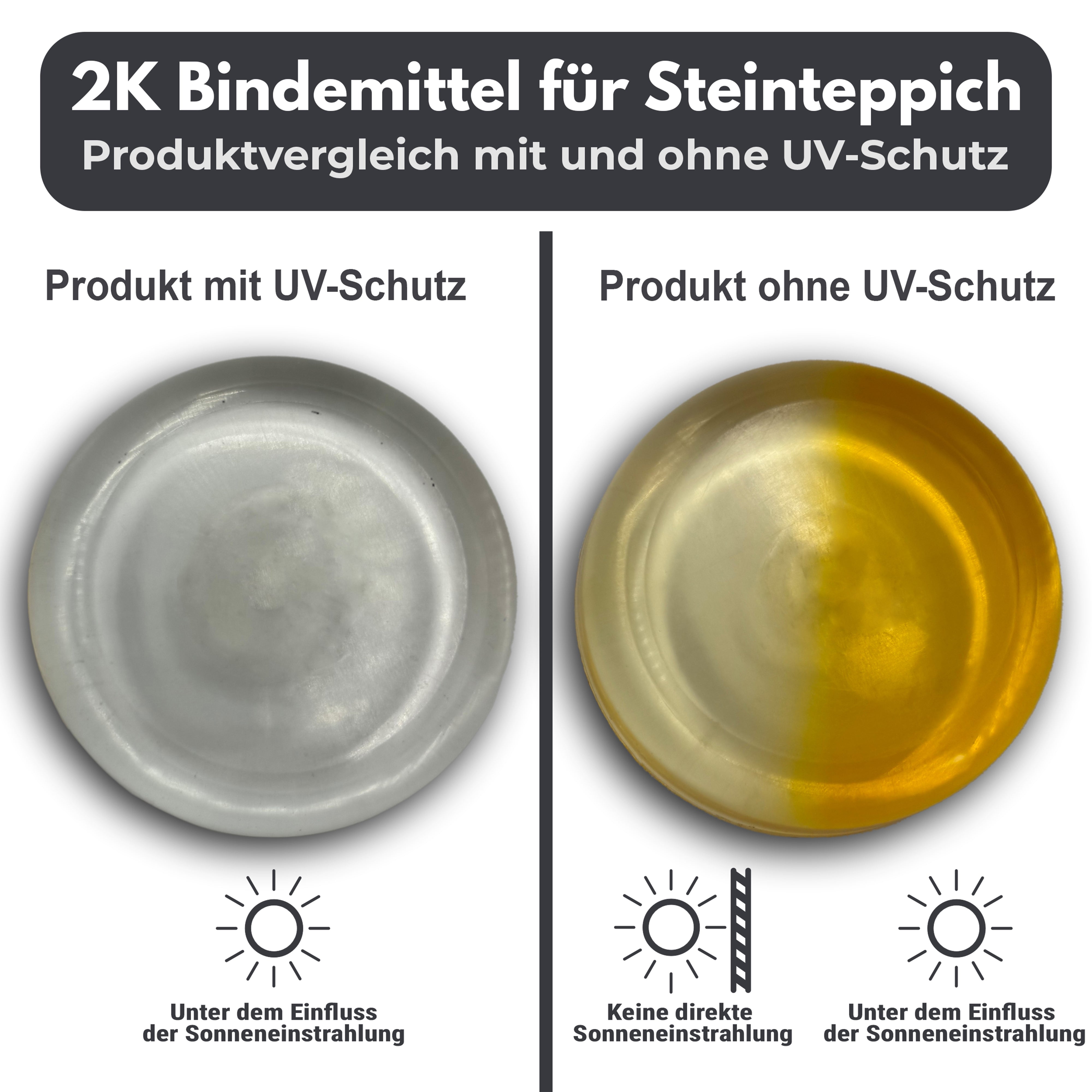 The binder agent for the stone carpet is composed of two components. These must first be thoroughly mixed. Without this, the little stones would eventually come off the floor after a few years.