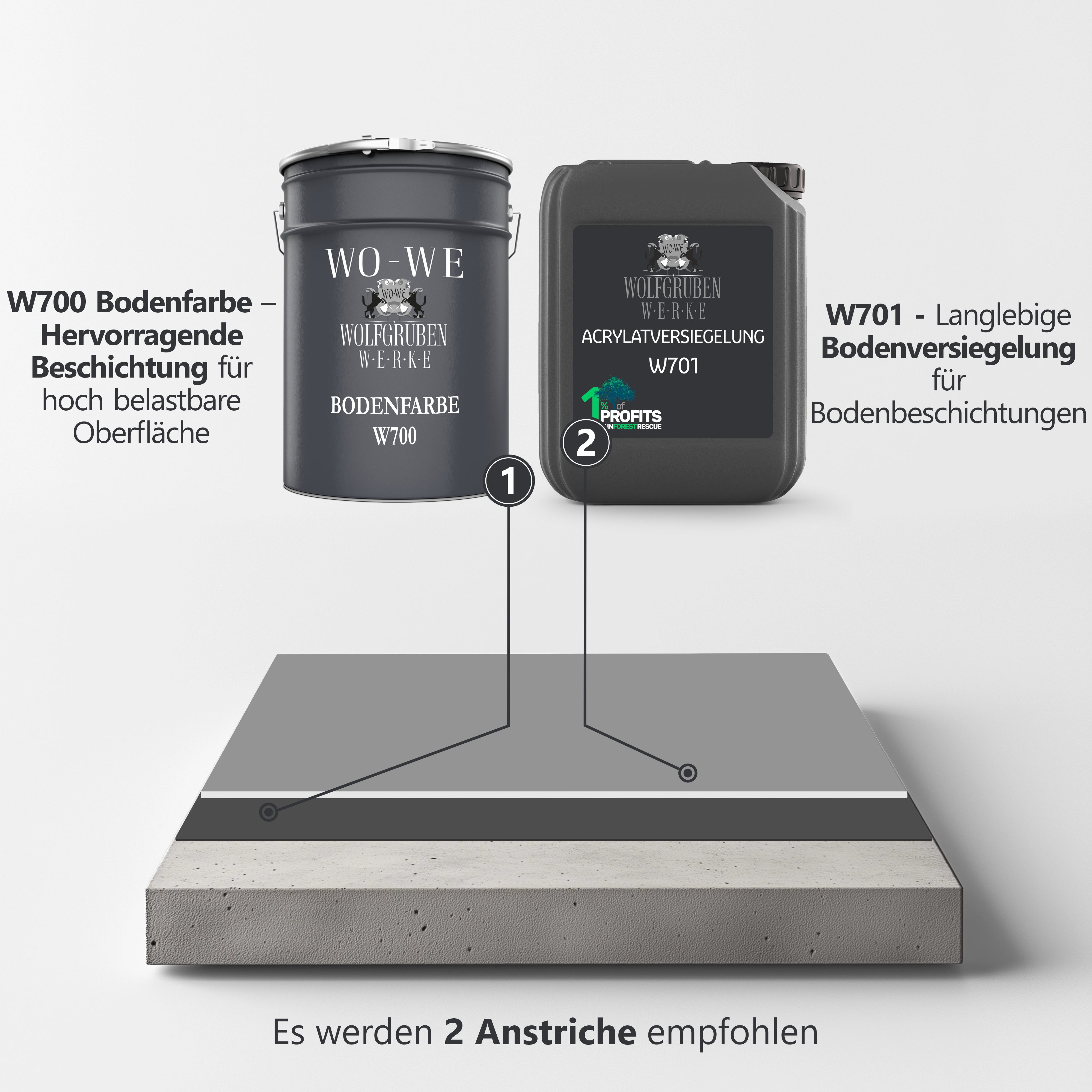 For garages and other floors with heavy traffic, we recommend our W702 2-Pack Epoxy Resin Floor Coating Paint Garage Concrete instead of the combination of W700 floor paint and W701 Acrylic Sealant due to its significantly higher durability.