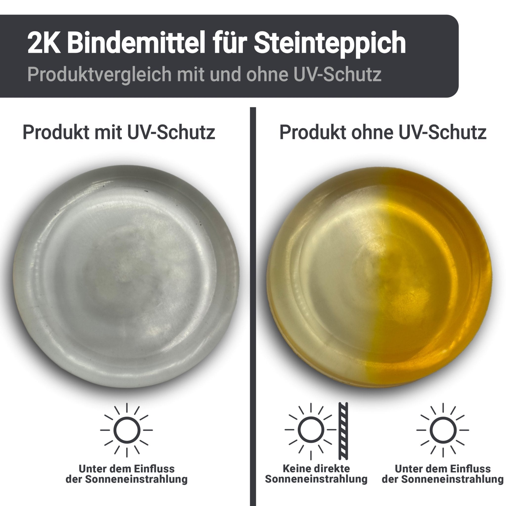Elagente aglutinante para la alfombra de piedra consta de dos componentes . Estos primero deben mezclarse bien. Sin esto, los guijarros eventualmente despegarían del suelo después de unos años.