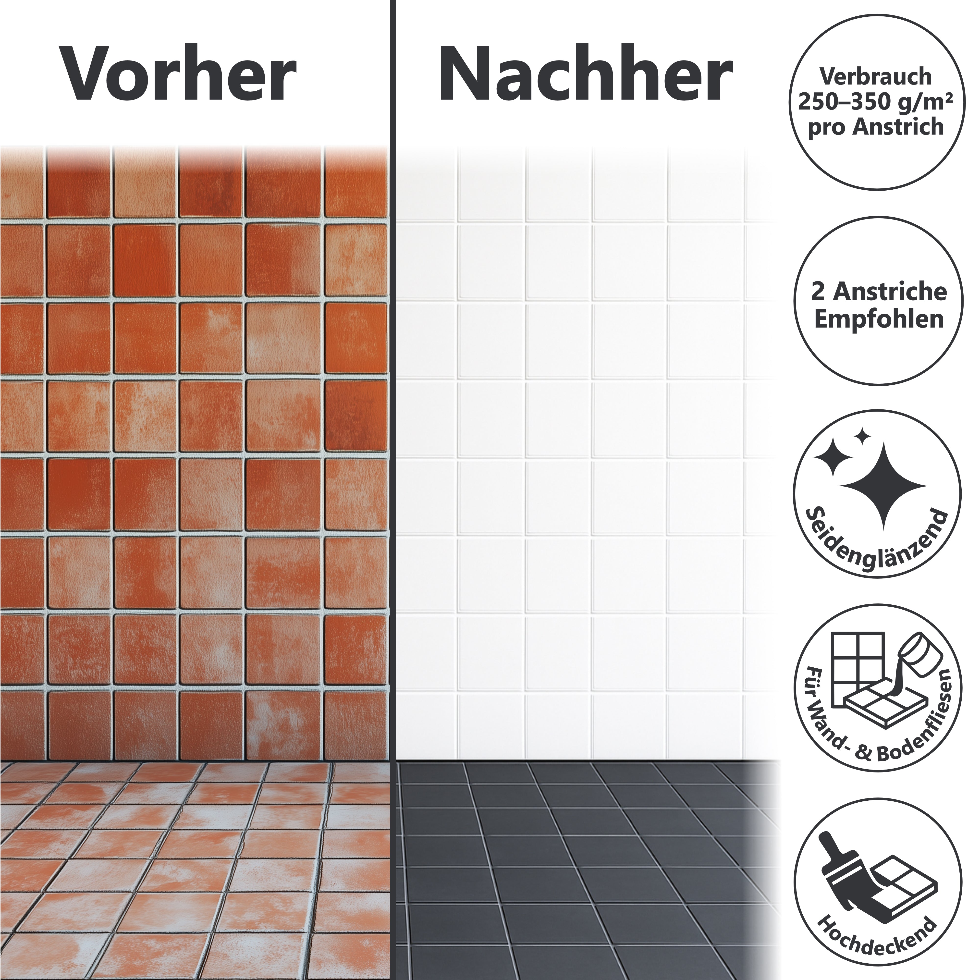 También recomendamos nuestro barniz para baldosas 1K para superficies sin contacto directo con el agua. La aplicación de laca para baldosas W713 es aún más fácil, la laca es brillo sedoso.
